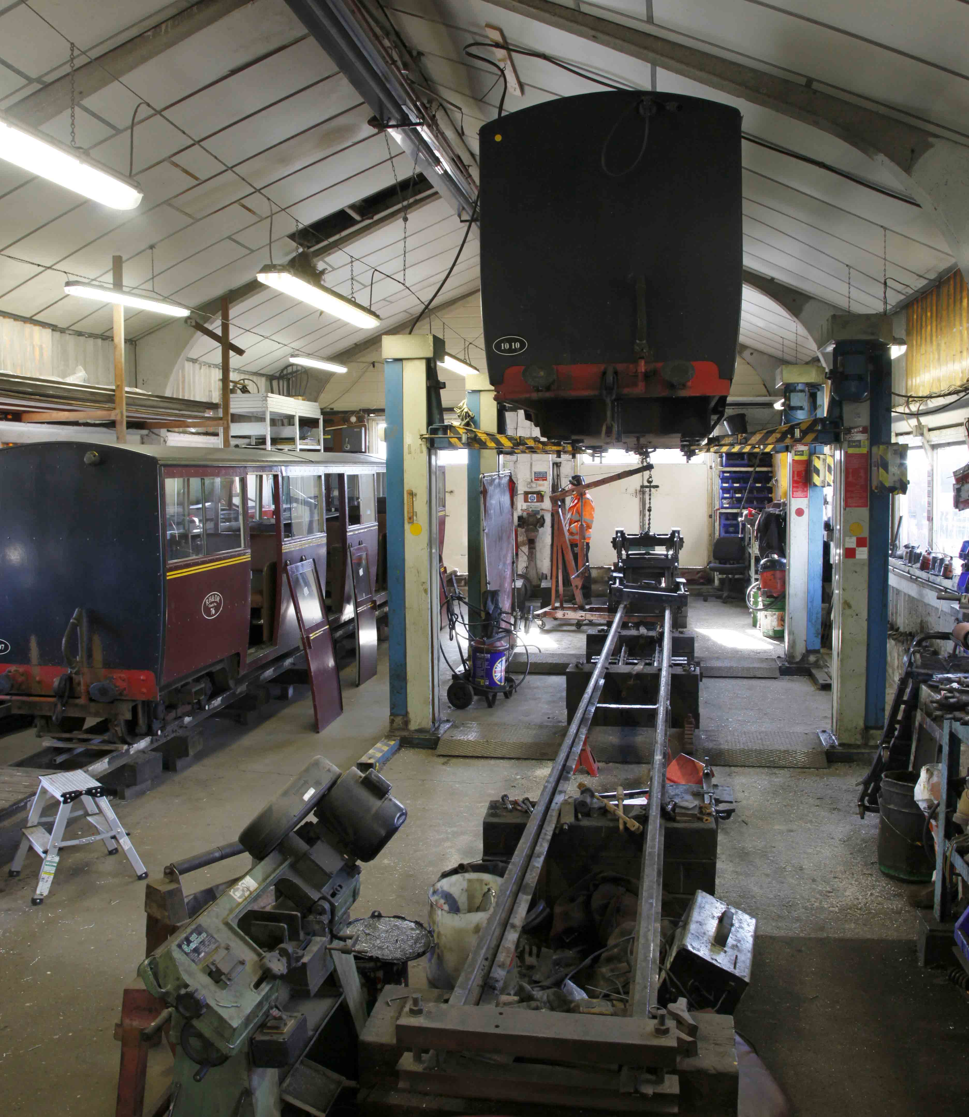 First to the carriage shed. Twice a year every carriage is given a service. They are lifted on a hydraulic jack, the bogies are removed and the chassis, brakes and bogies serviced. No pits here.