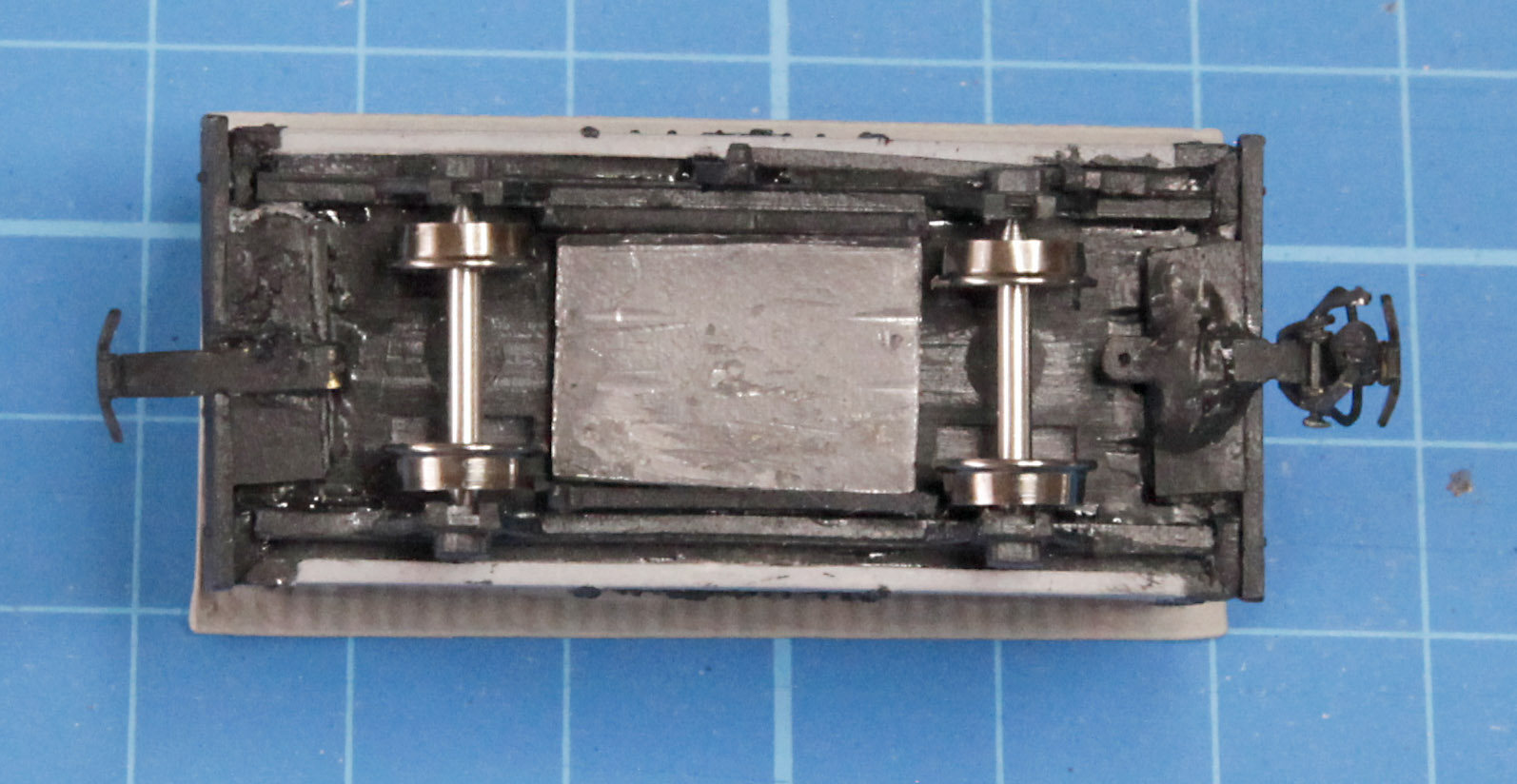 A small amount of lead to add weight to the wagons and coaches helps running and stability. I used sheet lead, about 2mm thick, originally for roof flashings. It is easy work. Cut the sheet to size with a pen knife and glue in place with superglue. I attached it to the underside of the wagon or coach, between the wheels, to keep the centre of gravity as low as possible.