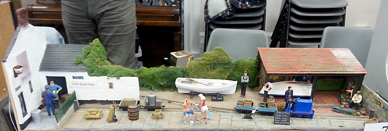 Chris O’Donoghue exhibited Compass Point.  His highly detailed OO9 layout is full of interesting scenes and cameos. It was very popular with the visitors.