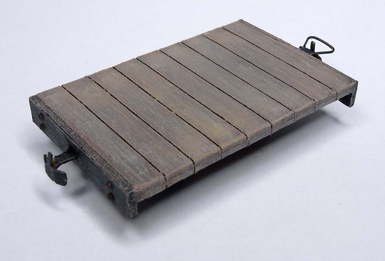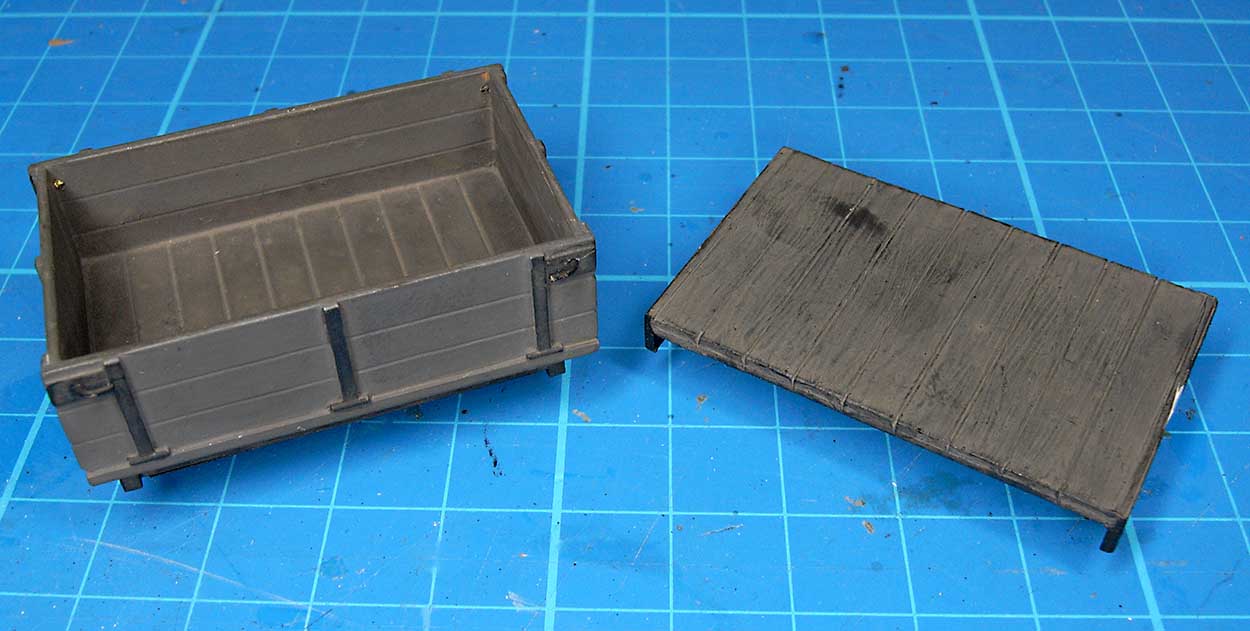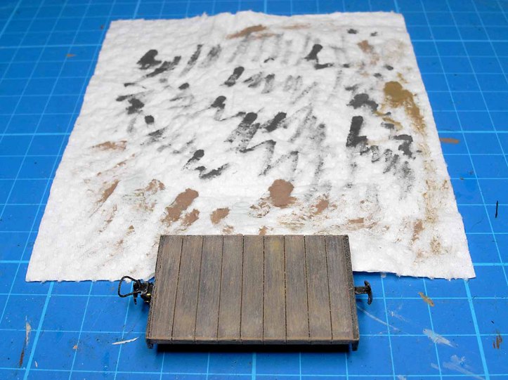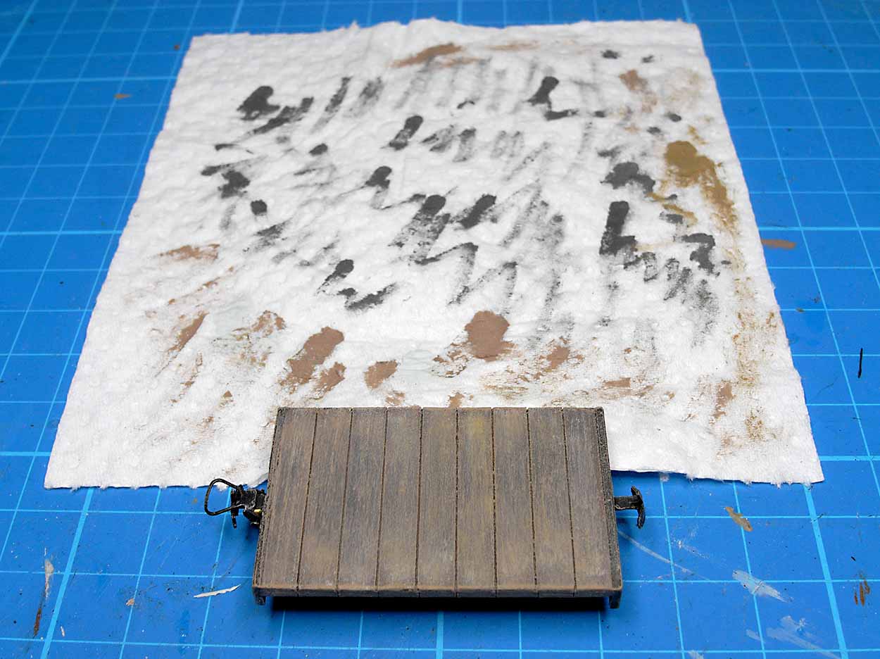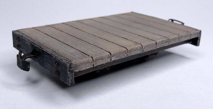 I chose the flat wagon, gave it a coat of Humbrol 160 German Camoulfage Brown, and then dry brushed it with a wide range of browns and black. When I dry brush models, I dip the brush into the paint, wipe the brush on paper until it leaves virtually no trace of paint and then run the brush over the model.