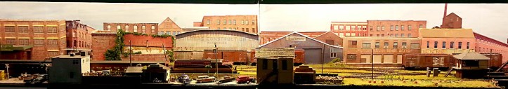 This is Eastwood VT in OO scale by Andrew Knight. Many layouts have a single line of low relief buildings as a backscene. In some cases the buildings are very shallow and lack depth. Andrew had taken a different approach that I thought worked very well. He created three different layers to the backscene: low relief buildings, thin card board cut outs of buildings, then the backscene.