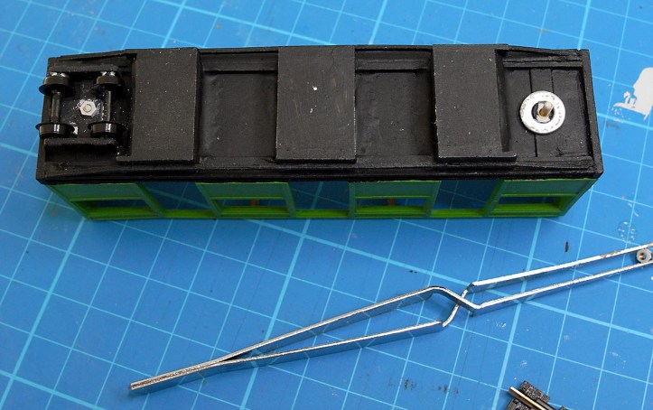 I found some small washers in ‘bit box’ and placed these between the chassis and the bogies. The washers are too large in diameter really and they are rather ‘sloppy’, but they are the smallest size I had.