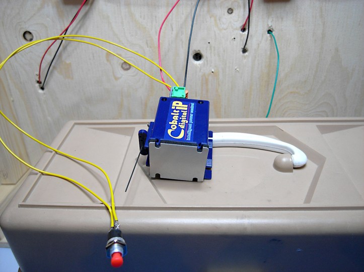 You can use DCC commands to change the point, however I like control panels with switches to control points. (Call me old fashioned…) Cobalt provide built in terminals for ‘manual’ point operation. I connected two wires (yellow) to a ‘push to make’ switch and connected these to the terminals on the motor.