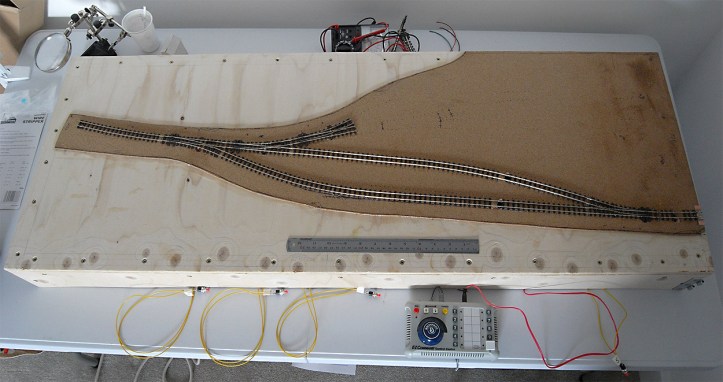 Next, the point motors were screwed into position under the baseboard. The droppers from the rails, the wires powering the point motors and the wires to the frogs were soldered to the bus wire. I’m definitely not a ‘sparky’ so I took my time and double checked everything. Then, I connected the push to make switches that will operate the points. These are the yellow wires poking out from undernearth the baseboard – a temporary installation during testing.