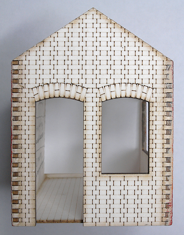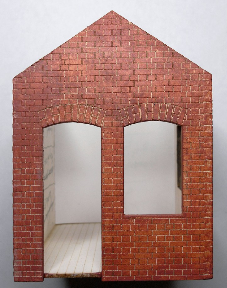 Turning to enamels, I painted another wall of the building with Humbrol 121 to give a mortar coloured undercoat. Then I dry brushed different enamel paints over the surface. This was much more successful.