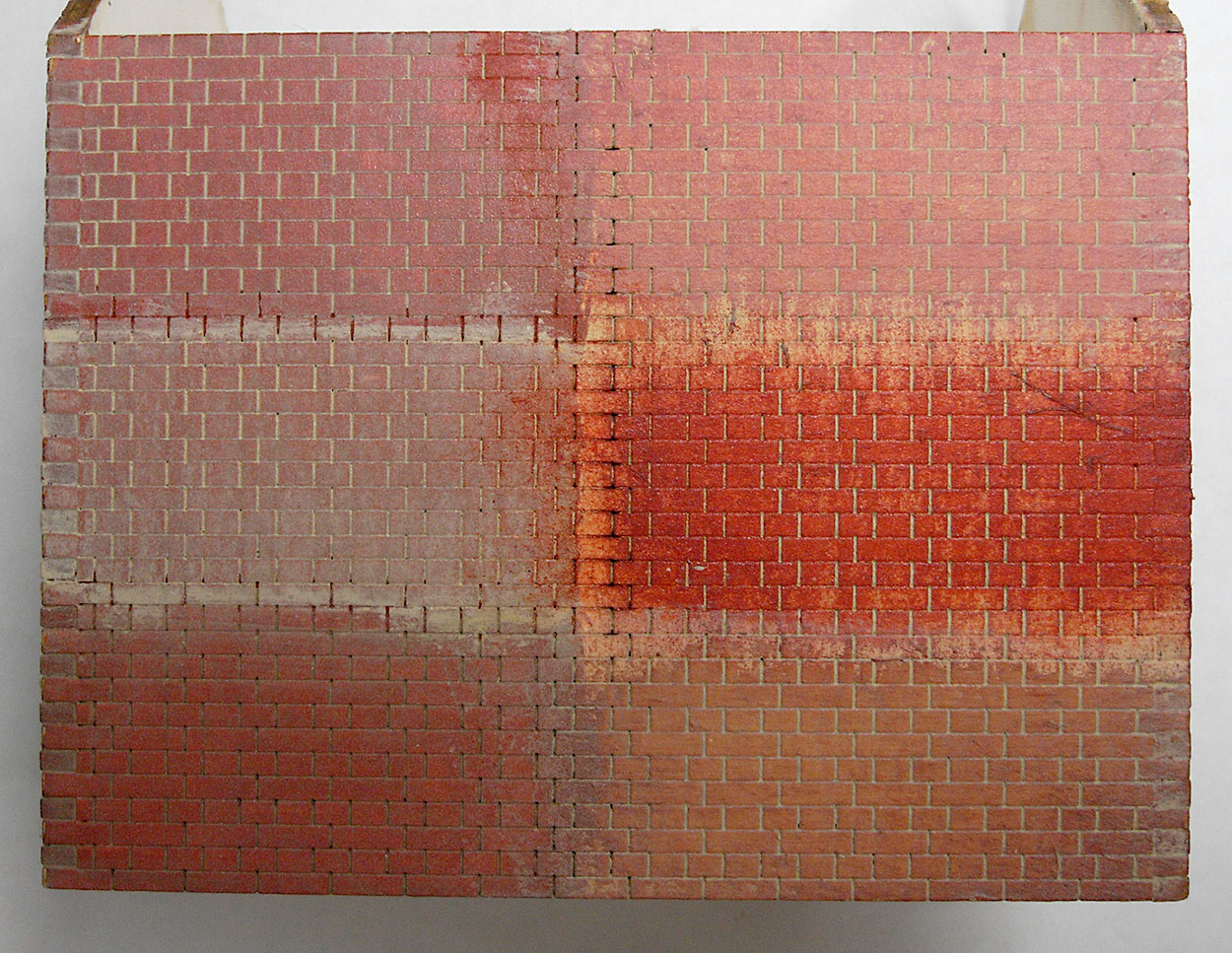 Firstly, acrylic paints. I painted one wall of the spare building with two different mortar colours, a lighter one on the left and a darker one on the right. Then I dry brushed different reds and red-browns over the surface to see if they would create a realistic brick effect. Normally, I’m quite successful at dry brushing acrylics but this time I must admit I was disappointed with the results.