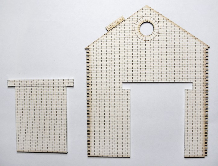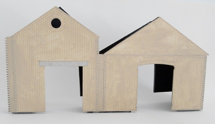 The join between the two pieces of wall on the right hand side of the building wasn’t quite flat. The components were made of different thicknesses of fibre board (I suspect they came from different kits) and I wasn’t able to align them perfectly. This was disguised by adding a small piece of decorative brickwork over the join.