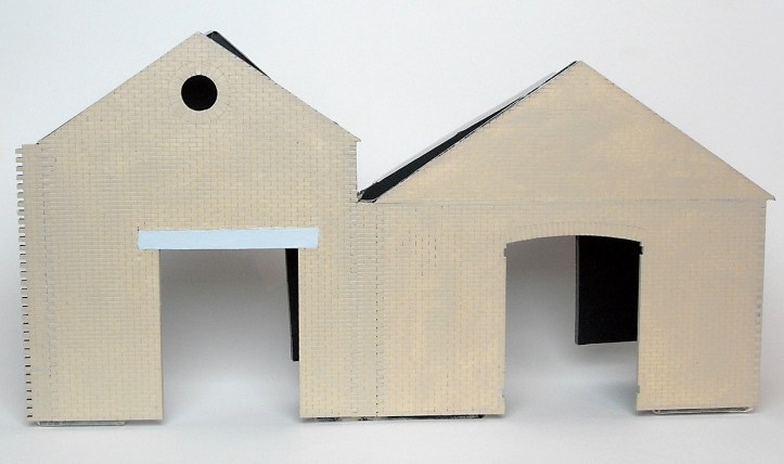 Here’s the building after the first coat of paint, Humbrol 121 Matt enamel.