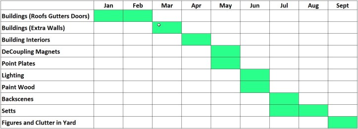 To help me focus I made a simple plan, listing the main tasks to be done and estimating how long each one will take. To be honest the timelines are very much a ‘guesstimate’, modelling is a hobby and the time available is influenced by all the other things in my life. However, it’s good to have a plan and creating it has shown that completing the layout by the end of the year looks feasible, if I apply myself!