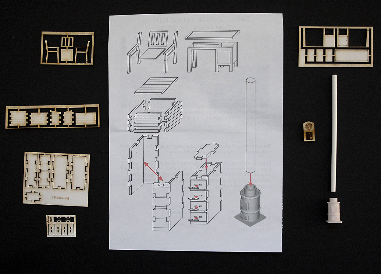Not wanting to spend time scratch building I was pleased to find LCUT make a kit for the interior of the office. It includes a desk, chair, filing cabinet, coal box, a clock and a stove. As you can see they are easy to make and I spent a very productive Saturday afternoon making and painting some of them.