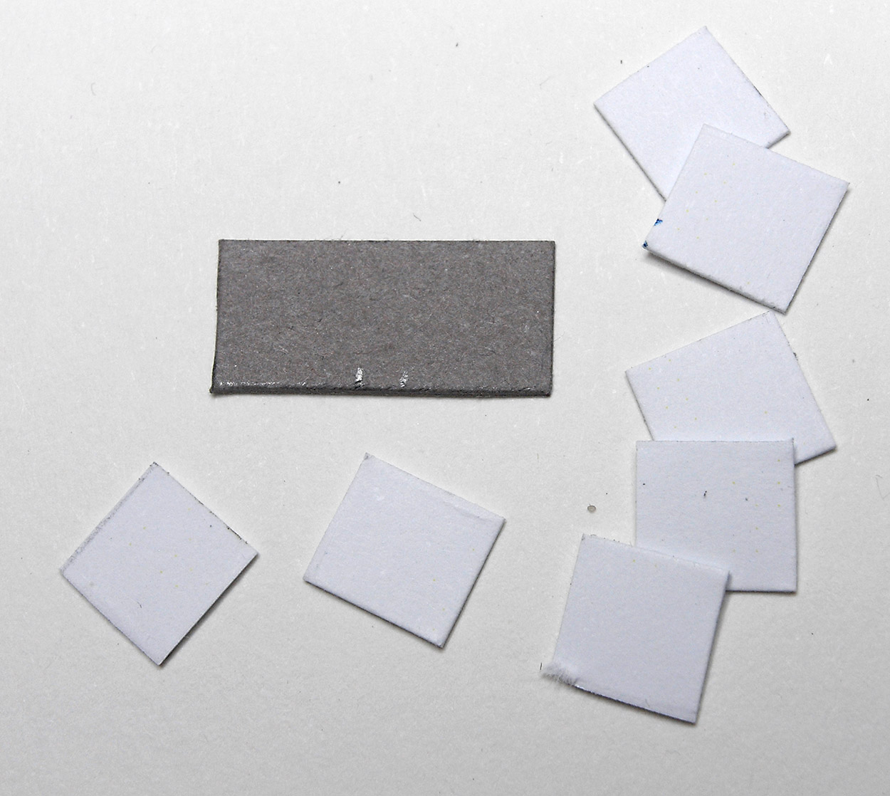 The grey card represents the cover and the white card was placed on both sides of the grey card to create an open ledger, or sandwiched between it to create closed ones. These were glued on the desk and filing cabinet.