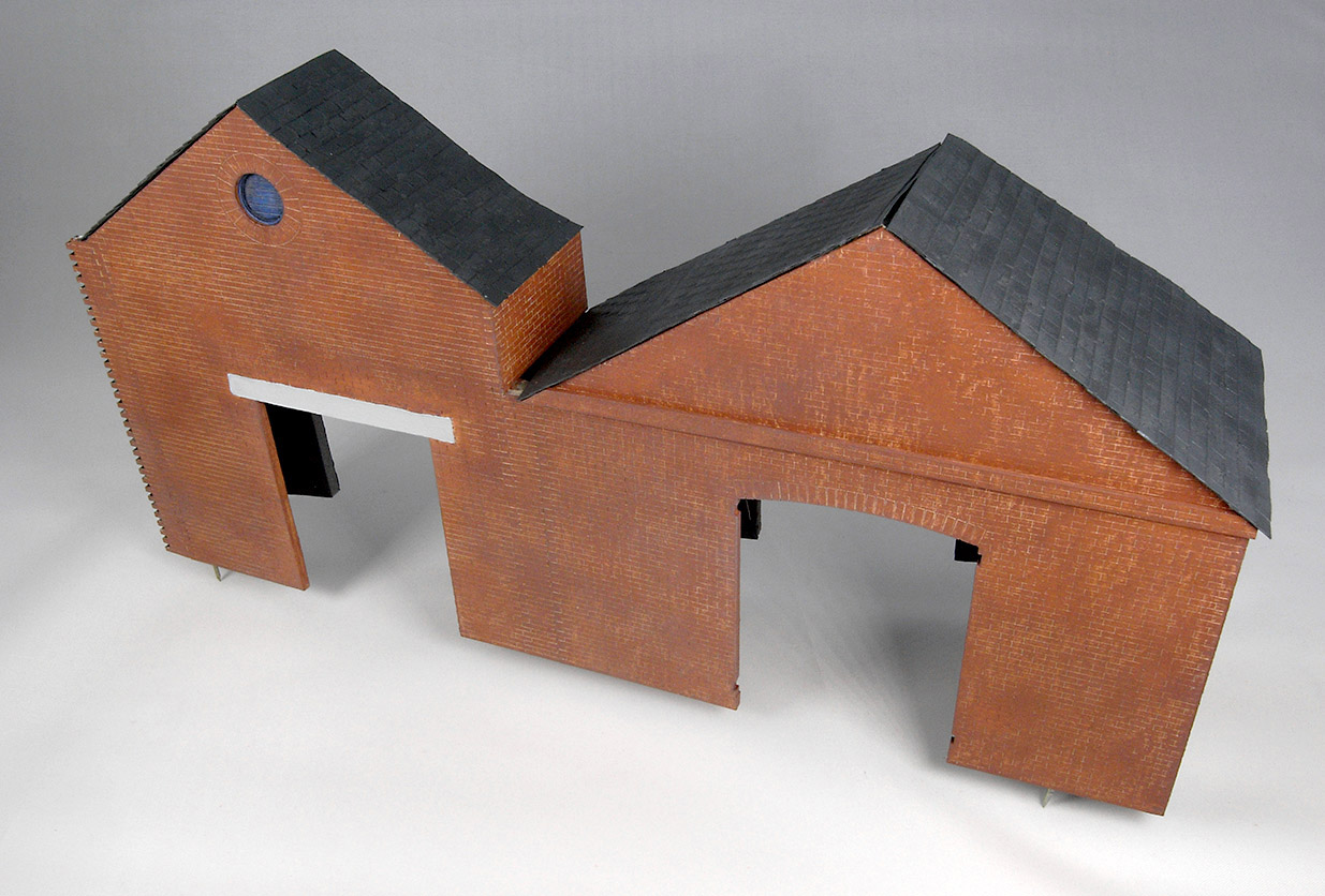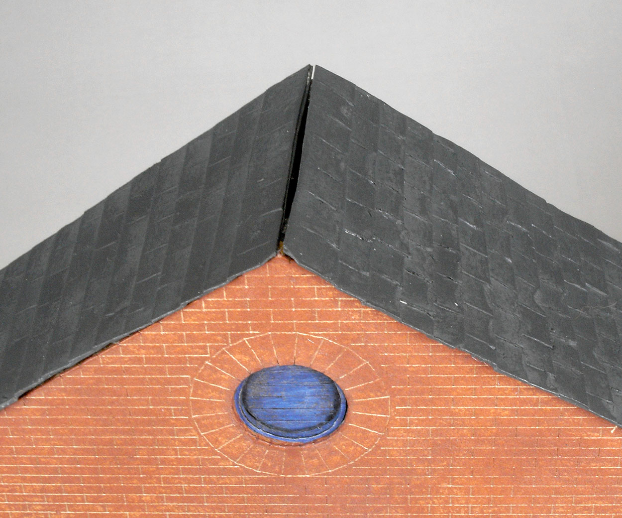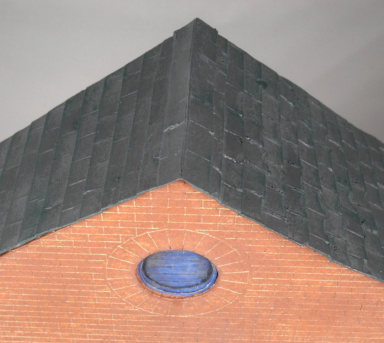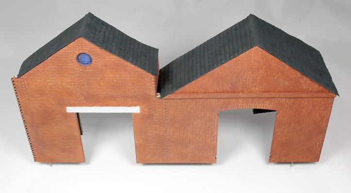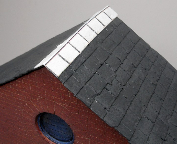 There were small gaps at the ridges of the roof. Ridge tiles were made from pieces of card and after a couple of coats of paint the gap was disguised quite well.