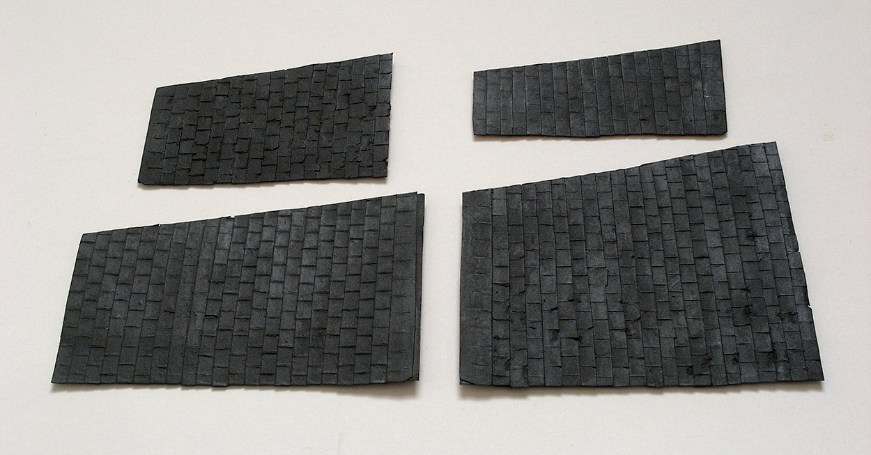 To create the roof, a piece of card was cut to the size and shape of each of the four roof sections. These were covered with strips of card to represent the tiles (as described in this blog). Last time I did this the card warped and the roof wasn’t a snug fit to the building. After reading the blog a couple of people wrote to me with advice for solving the problem. Chris Seago suggested adding a piece of card to the interior of the model, and Chris O’Donoghue suggested painting both sides of the card. This time I did both of these things and the roof components are much flatter. Many thanks for the suggestions guys!