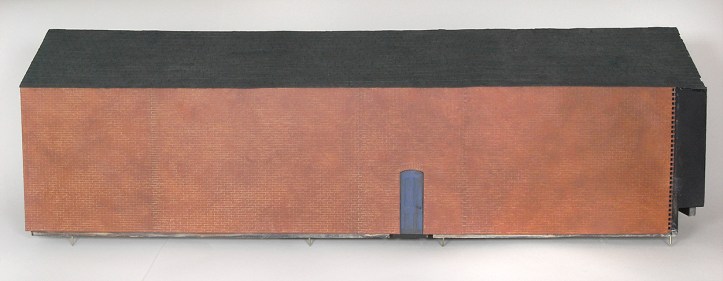 To make the roof I printed the outline of the tiles onto sheets of thin card, cut them into strips one tile wide and partly cut through the card to represent the gap between individual tiles. Then I introduced some variation in the tiles by working along each strip cutting the corners off of some tiles, thinning the card on other tiles and so on. When I glued the tiles onto the ‘roof’ I applied them in strips of 35 tiles at a time. It took a long time, hence the lively music.