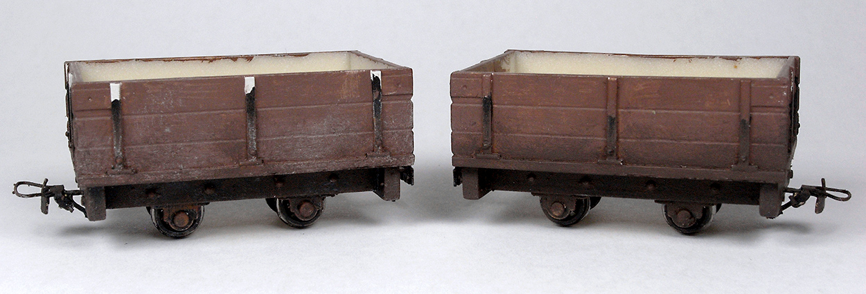 Next the wagons were painted. To introduce a little variety I gave one a dusty grey weathering and the other a dirty brown weathering.