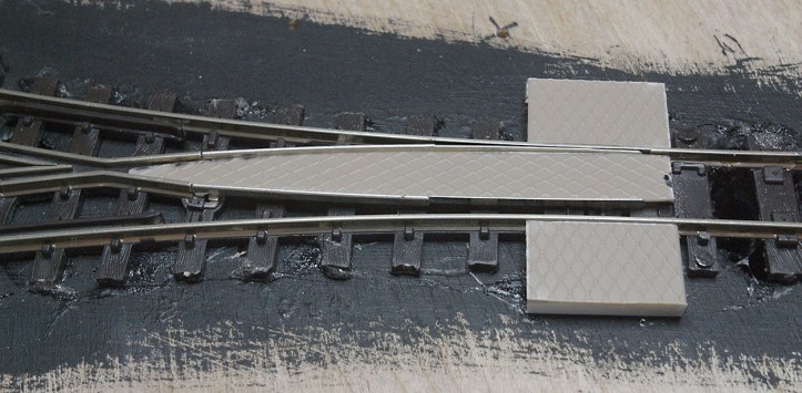The yard of the engineering works will be covered in stone setts made from DAS modelling clay. However, I don’t want to put clay around the moving parts of the points. Instead I decided to use chequer plate plasticard to create ‘metal’ inserts for the points.
