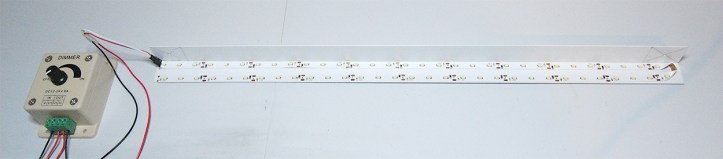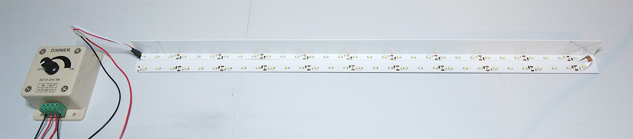 The LEDs were stuck to a short length of right angle plastic molding and wired up to a dimmer switch. The soldering iron from the O Gauge Guild second hand stall worked perfectly for this job.
