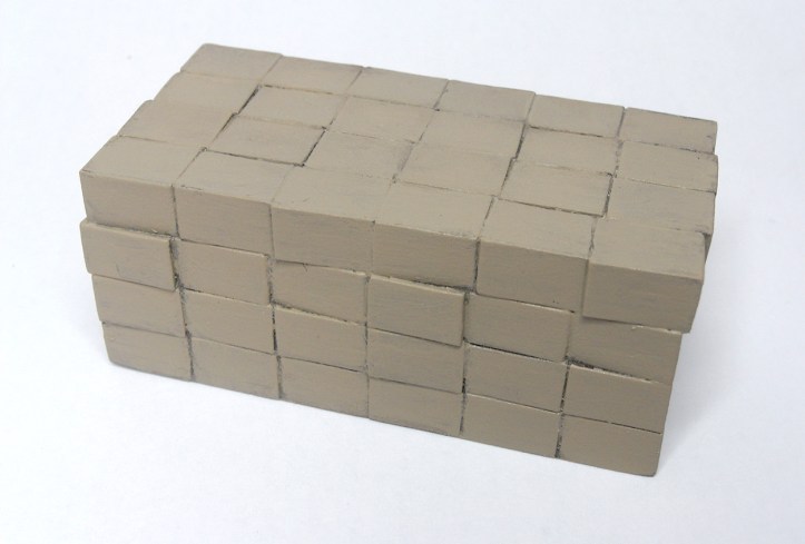 Next, a quick sand, a coat of primer, a coat of light brown paint and a wash of diluted black to highlight the lines between the cartons.