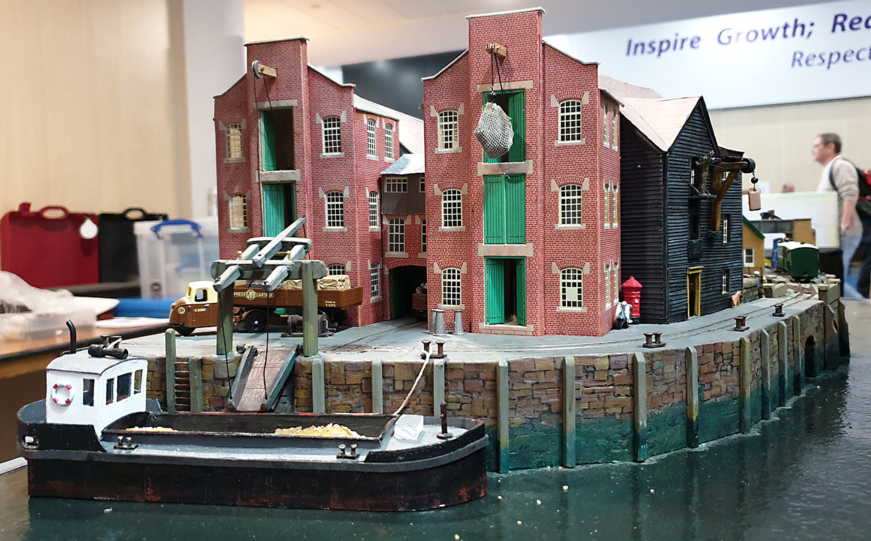 Finally, a layout you can walk around and view from every angle. East Quay by John Niblett is a charming 009 layout built mainly from card, often recycled cereal packets. The warehouses were made from card covered in brick paper, and the metal hulled boat made of card too.