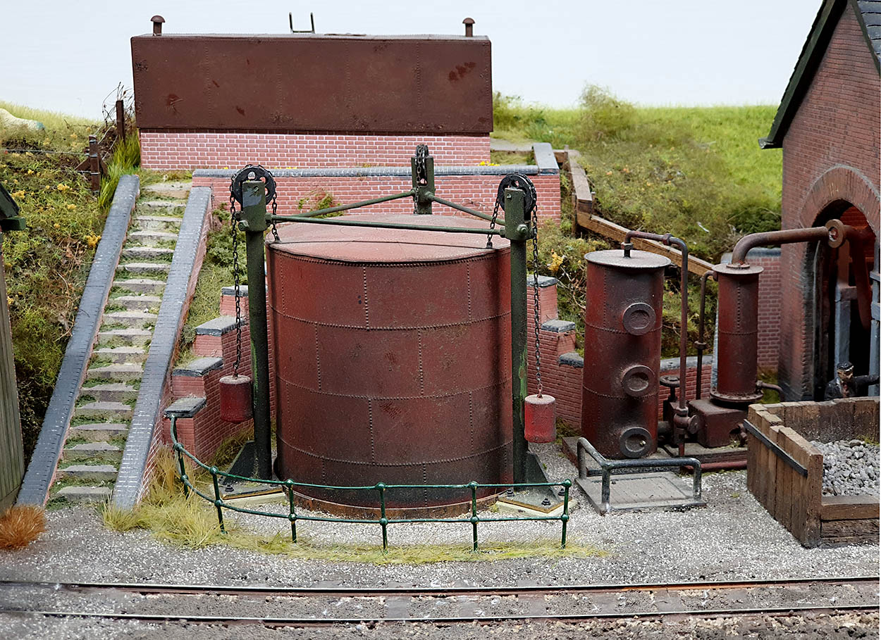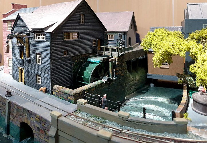 The rotating water wheel was constructed from card, powered by a motor from a OO scale loco and is driven by a ‘belt’ made of cotton thread.