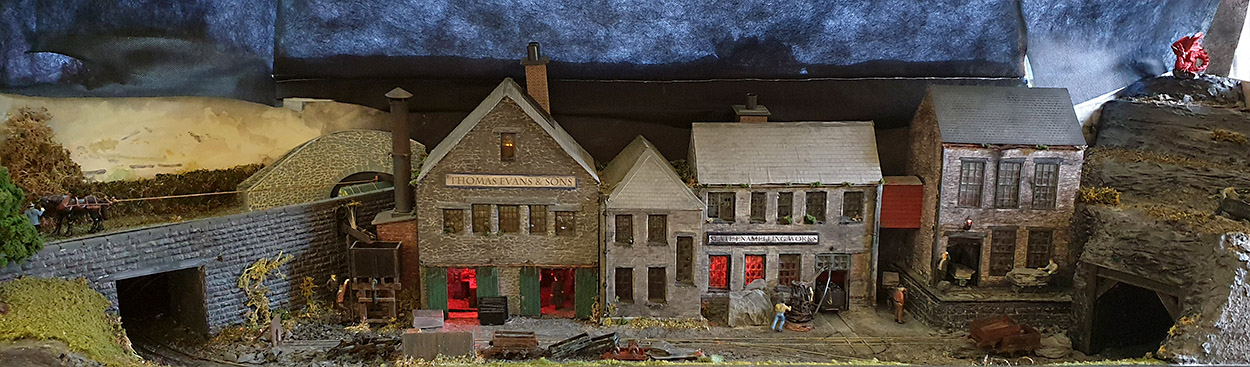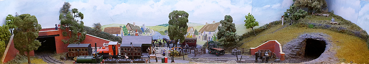 A small narrow gauge layout in 7mm/ft scale 16.5mm gauge (0-16.5). One side depicts an idyllic English village through station, the bright side, and the other contrasting side a slate works, the “satanic mills of North Wales” – the Dark Side!