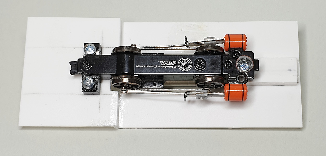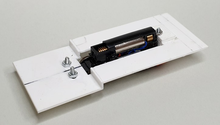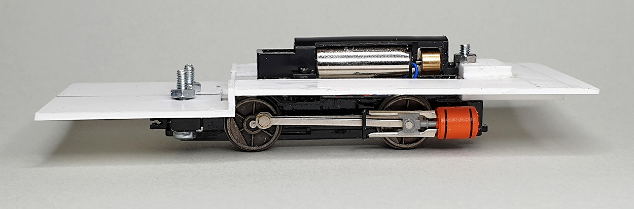 The cab will be ‘stepped down’ below the level of the rest of the loco. The cab footplate is mounted directly on the chassis using two bolts through the original mounting holes. I’ve used some small pieces of plasticard as packing under the front part of the footplate.