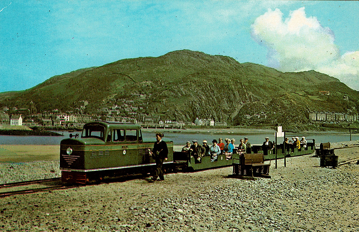 Digno out on the shingle in Fairbourne. Luckily the sun is shining on the passengers in the open coaches.