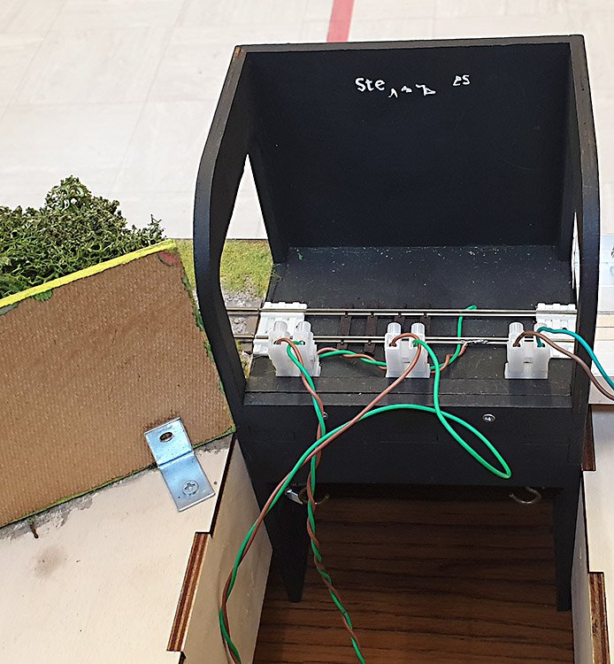 The modules are linked by these linker units. They are connected to each board via ‘Plug and Socket Terminal Strip’ connectors. The middle connector allows the operator to connect their controller to control trains on the ‘mainline’ between the modules. Bob has added a separate connector on his module to allow him to shut trains on the sidings while someone else is operating the mainline.