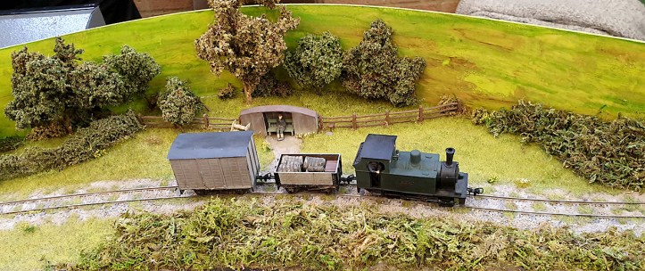 Yesterday was the Daventry MRC exhibition. It was a nice exhibition and I enjoyed nosing around the traders and the layouts. These included Tanybwlch by Nigel Smith an 009 model of the Ffestiniog Railway station in high summer sometime between the early 1990’s and the present day. It’s very well modelled with lots of interesting detailing, including this track gang (if two people can be a gang 🙂 ).