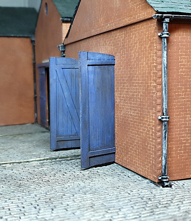 The doors for the arched entrances to the factory have been completed and glued in place on the layout.