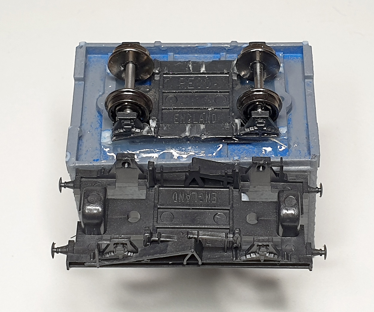 A chassis was required and so I turned to a Peco N Gauge chassis (NR-121). There are quite a lot of mouldings on the underside of the van. I cut the chassis so that it would fit between the mouldings and be as close to the floor of the van as possible.