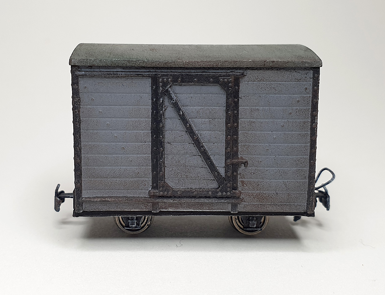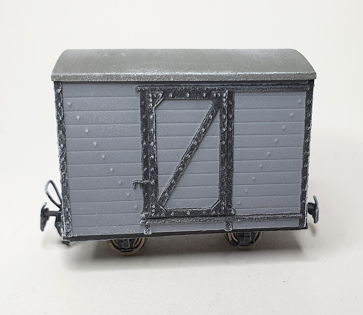 I spray painted the van in Humbrol grey primer using a rattle can. I rather like the colour of the primer so I didn’t add a ‘top coat’ of another colour. I carefully painted the metal work with Humbrol Dirty Black using a fine brush.