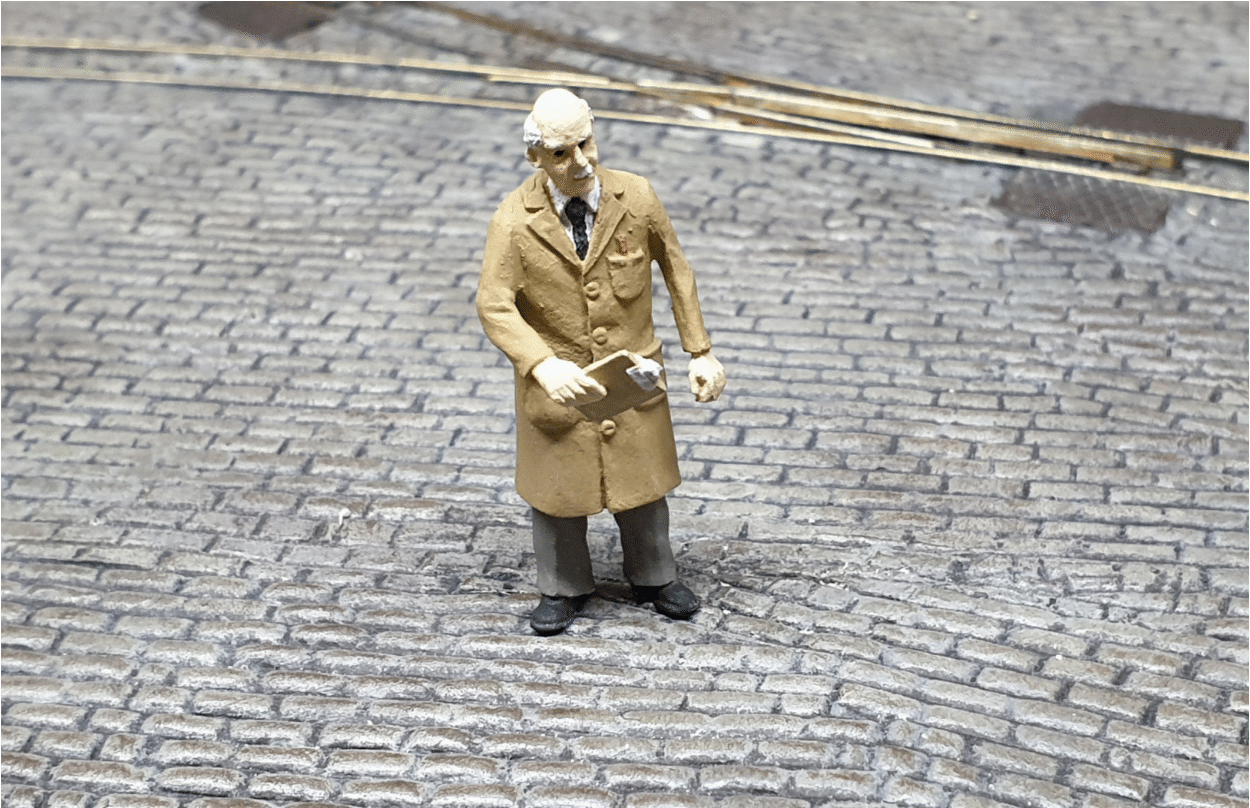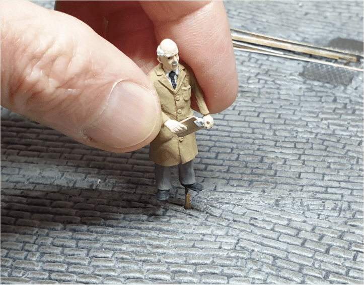For some time now I’ve been drilling a small hole in the legs of my figures and gluing a piece of wire in the cavity. The wire gives me something to hold while I’m painting the figure and, because I’ve drilled some holes in a scrap piece of wood, I can support the figure while it dries. The wire is very useful for fixing the figure on the layout. The man for Thomas and Sons (above) is 7mm (1:43) scale but it works well for 00 (1:76) scale people too (below). You can even use this approach for sheep!