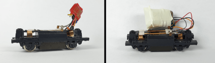 The Kato 103 chassis was fitted with a Digitrax DZ126 decoder and I’ve swopped this for a TCS KAM4-LED decoder with a built in ‘stay alive’ system. It was a simple job to solder the wires to the contacts on the chassis. (I don’t plan to use the LED capability… yet).