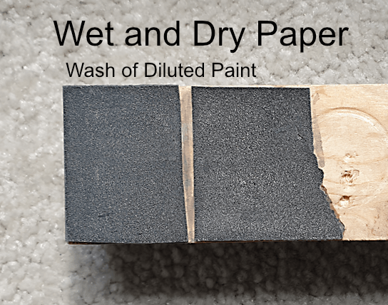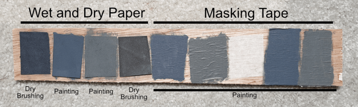 I glued some pieces of 240 grit wet and dry paper and masking tape to a piece of scrap piece of ply wood, then tried different painting techniques and colours. The results weren’t that impressive.