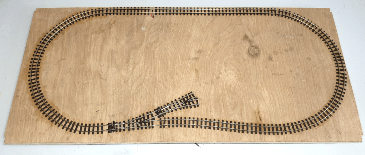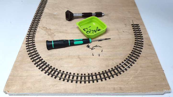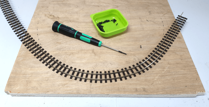 You’ll see I used 6mm track screws to hold the track in place. I find these much easier to use than track pins. I pre-drilled a hole in every fourth sleeper and gently curved the track. I positioned a pre-drilled sleeper, drilled a shallow hole in the baseboard to help hold the screw in place, then screwed the track into position.