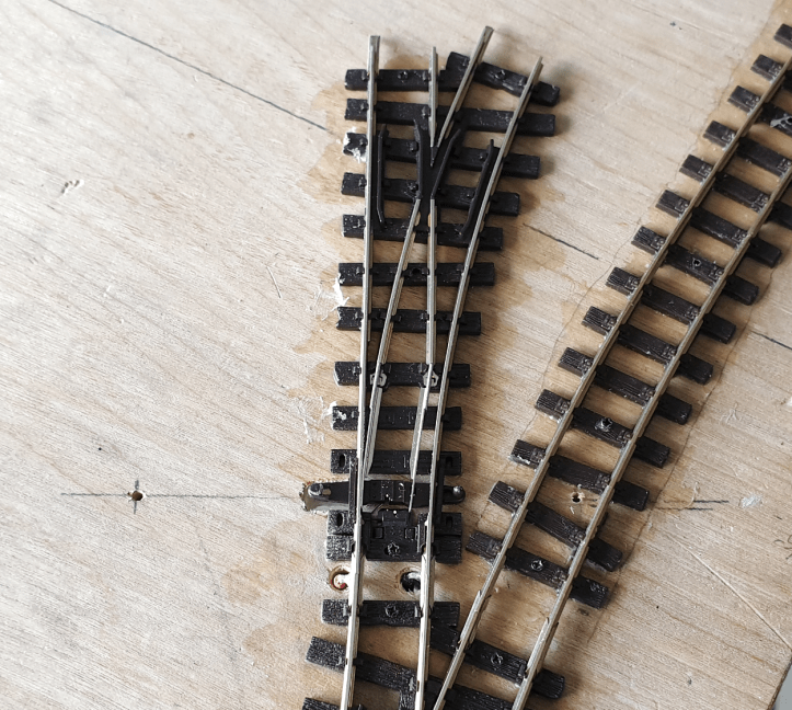 I had drilled the hole through the baseboard for the actuator pin from the point motor already. The next step was to draw a line to mark the line of movement of the point tie bar and drill two small holes through the baseboard, one at each end of the line.