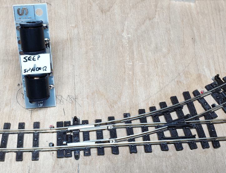 There’s very little space under the baseboard, around 20mm (0.8 inch), so I needed some small point motors. SEEP motors are only12mm (0.5 inch) deep and this made them a good choice. I chose the simplest model (GMC-PM2) because the points are insulfrog and there’s no need for frog polarity switching.