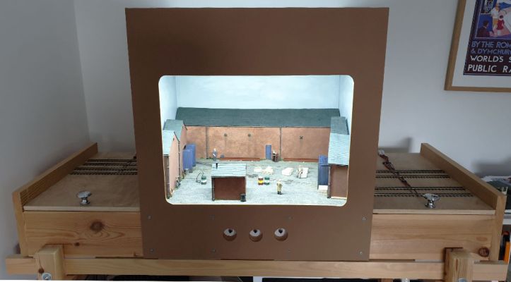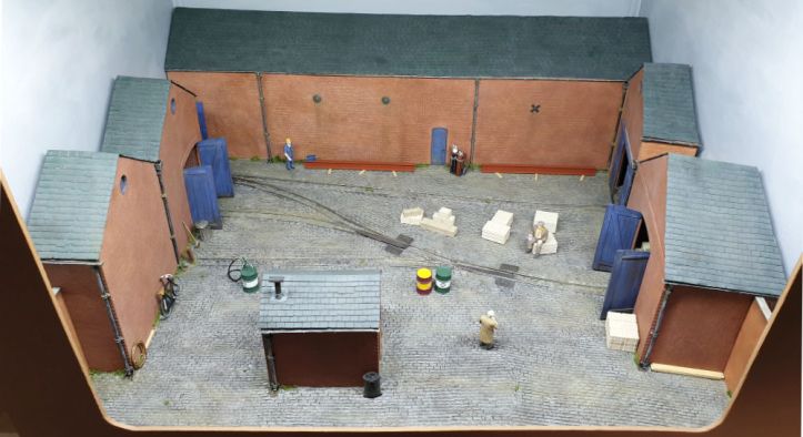 The scenic area represents the yard of a small engineering works. It is 21 inches (53 cm) wide by 18.5 inches (47 cm) deep. There are two traversers one either side of the scenic area. Each one has 4 lanes. Each lane is approx 10.5 inches (26cm) long.