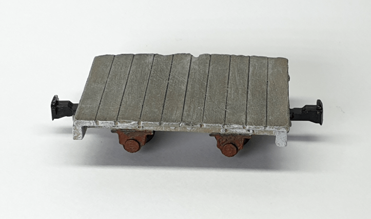 The approach was pretty simple. A couple of shades of grey to give the impression of aged wood and a little bit of rust colour on the axle boxes.