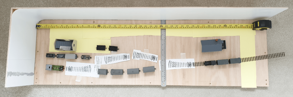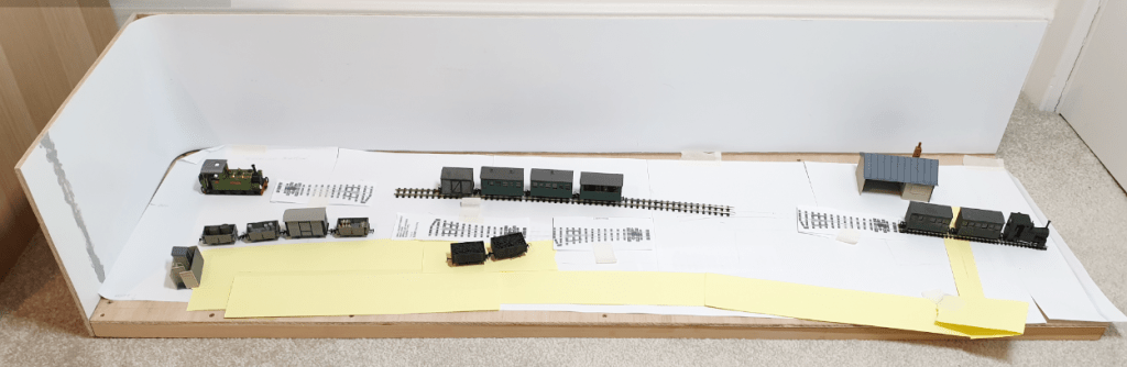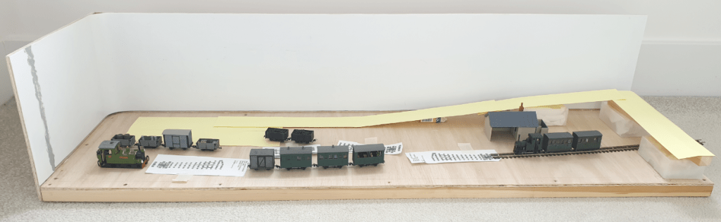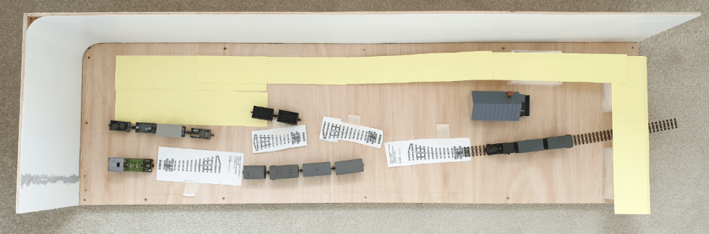 First I added some plasticard to give a smooth surface for the back scene. It’s curved at one end to mask the corner. The other end is detachable in case I ever want to extend the layout (!)