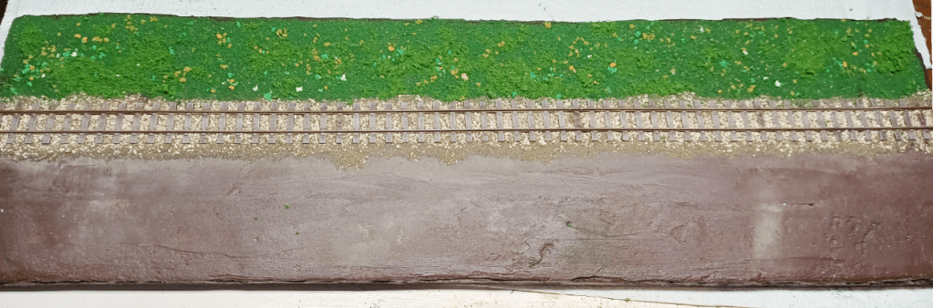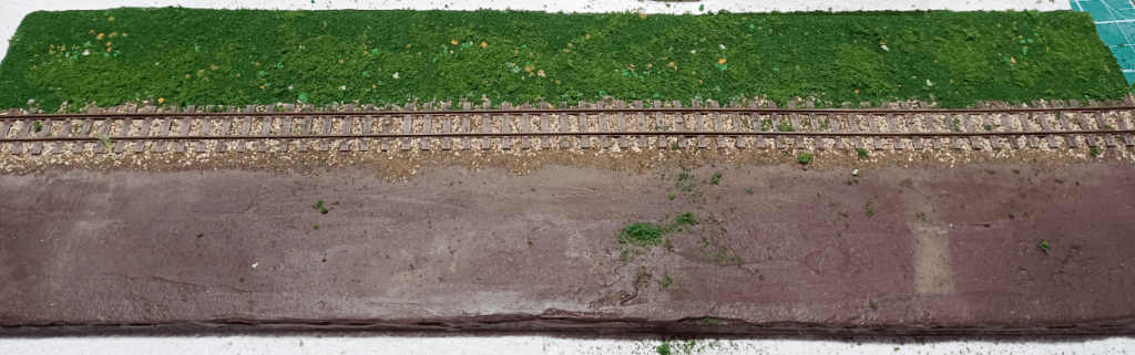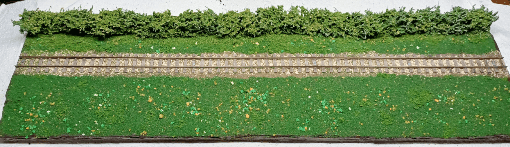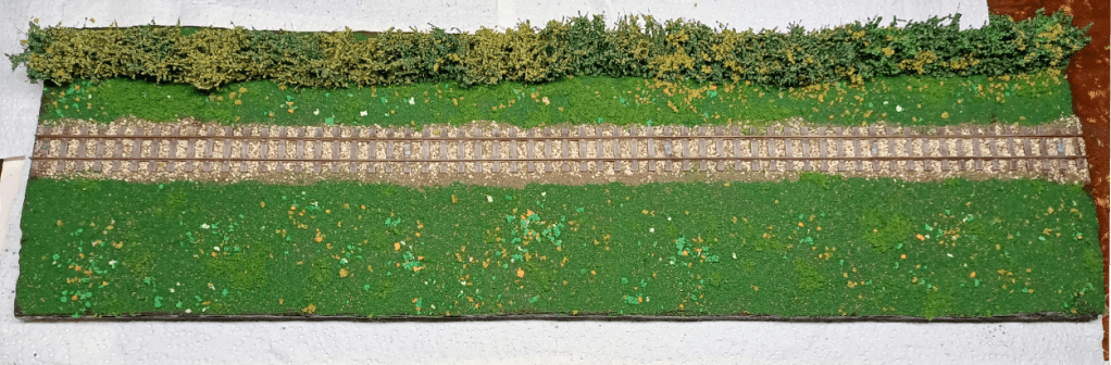 A generous coating of PVA and some coarse flockTopped up with fine scatter.Hoover off the excess and it looks OKAdd more scatter and some secondhand bushesDecide I don’t like the colour of the bushes so cover them in scatterApply some static grass. So far, so good..