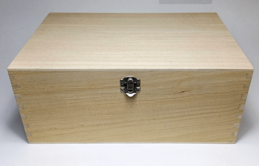 The layout has 6.5mm gauge track and HO scale rolling stock. It fits in a wooden storage box.
