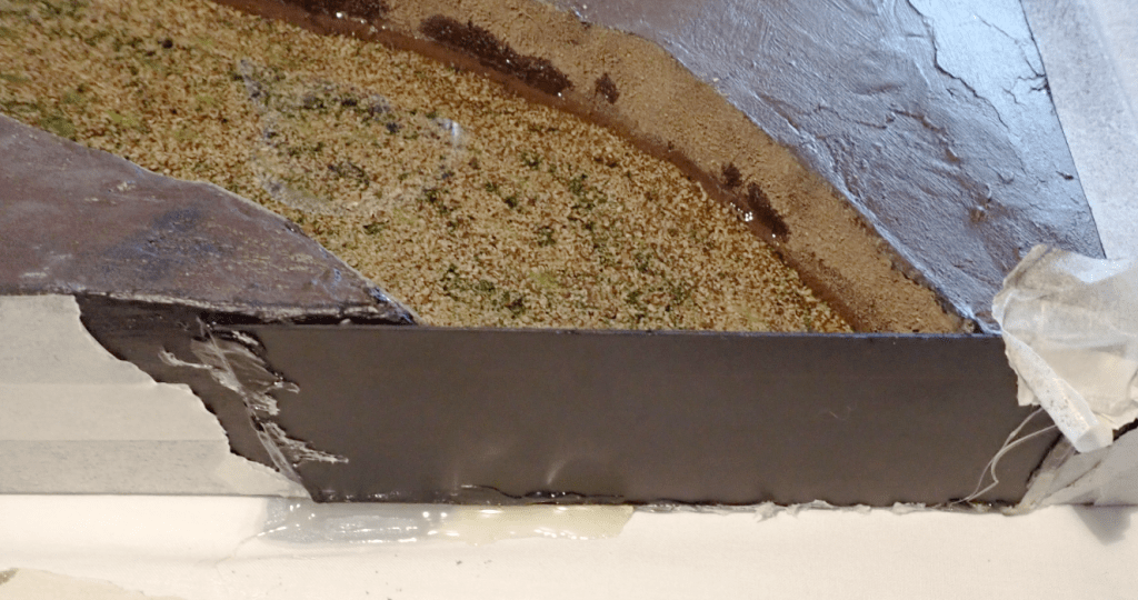 Second, once the resin was poured, lots of air bubbles began rising to the surface. Every time I thought I’d cleared them all, more appeared. I tried to mix the resin and hardener carefully to avoid introducing bubbles, but it’s possible that air was trapped in the soil and scenic materials beneath the surface and slowly escaped through the resin.