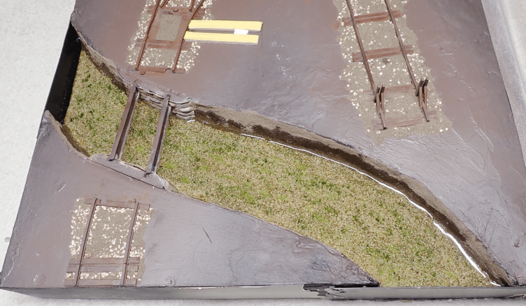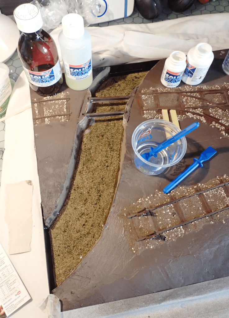 To fix everything in place, I used Ballast Bond, which has become my go-to glue for this kind of scenic work. As usual, once the glue is applied everything briefly looks terrible — a wet, messy patchwork of materials. Thankfully, once it dries the result looks much more natural.
