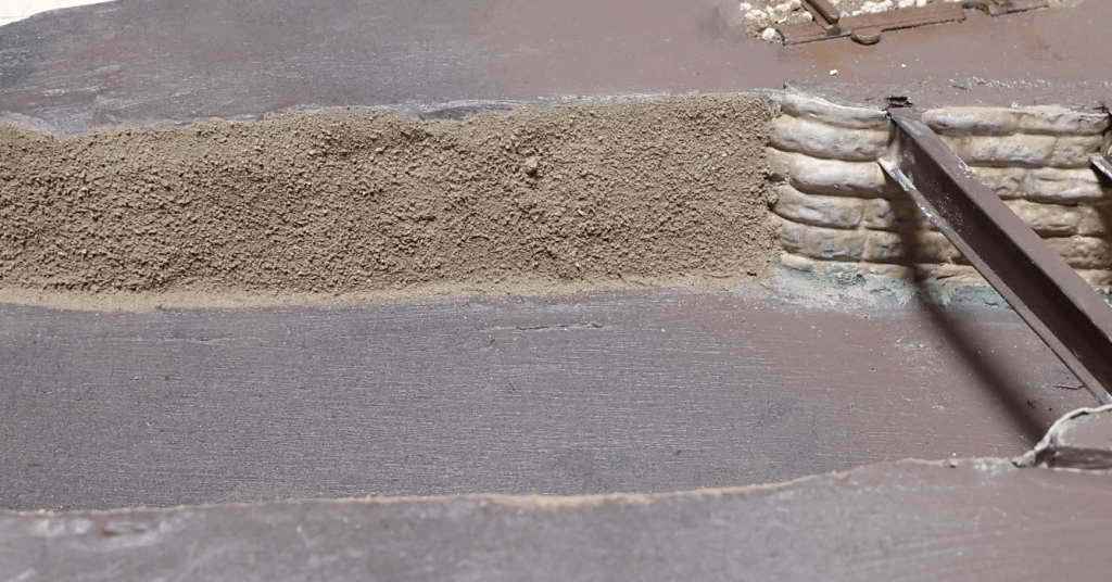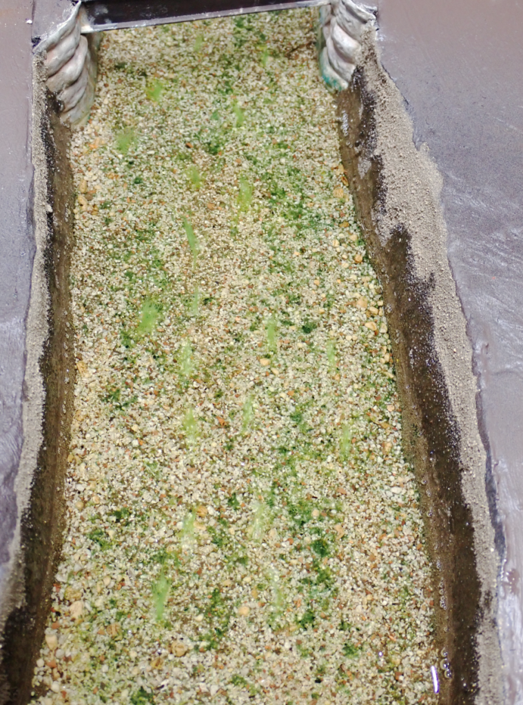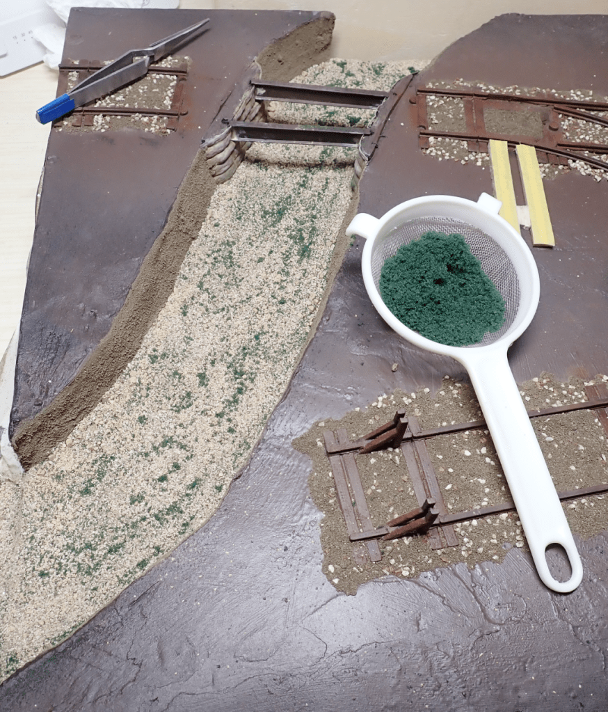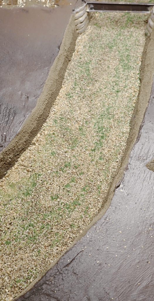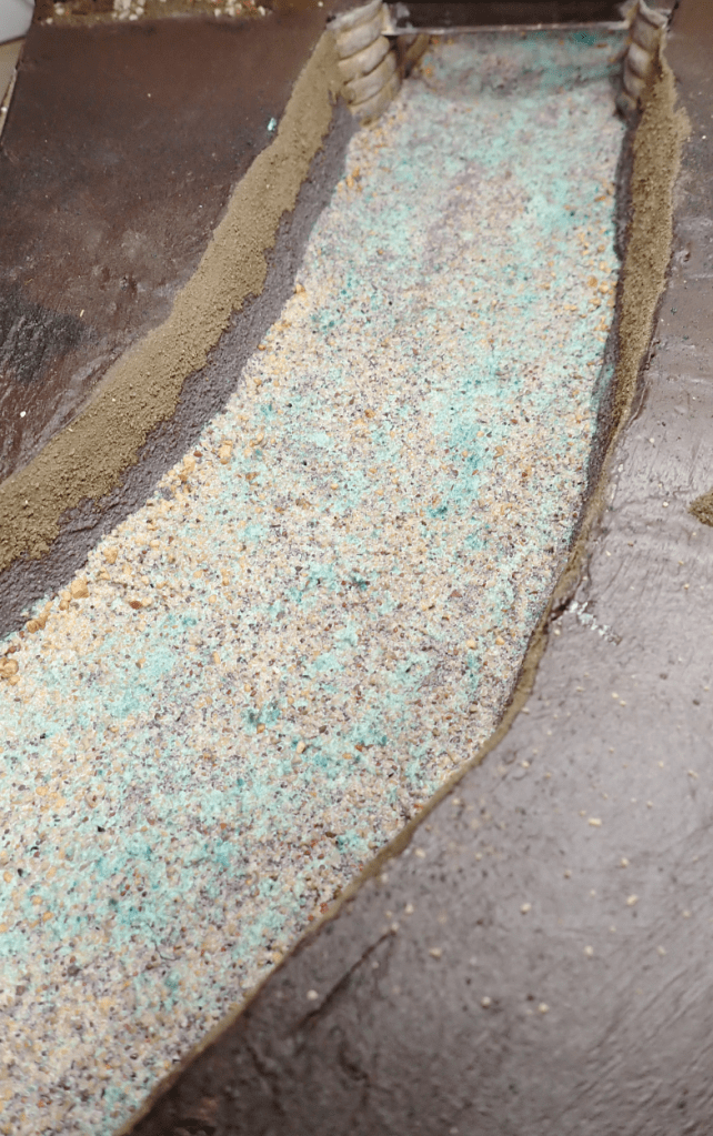 Next, I built up the riverbed using a mix of soil, sand, grit, and scenic scatters. This combination creates a varied, textured surface that mimics the gravelly beds you often see in real rivers.