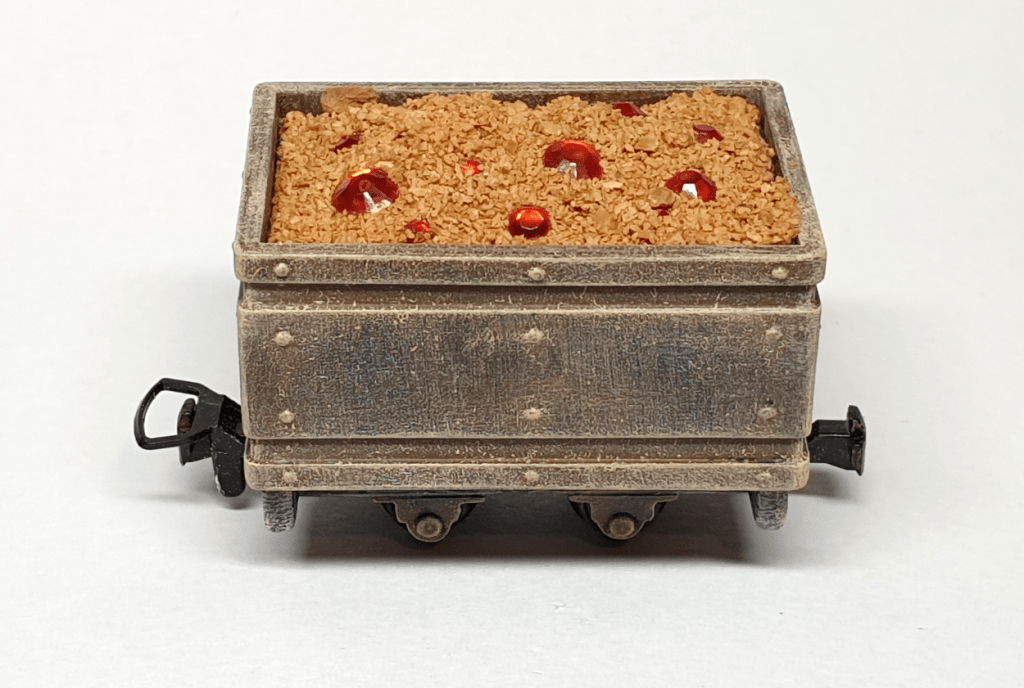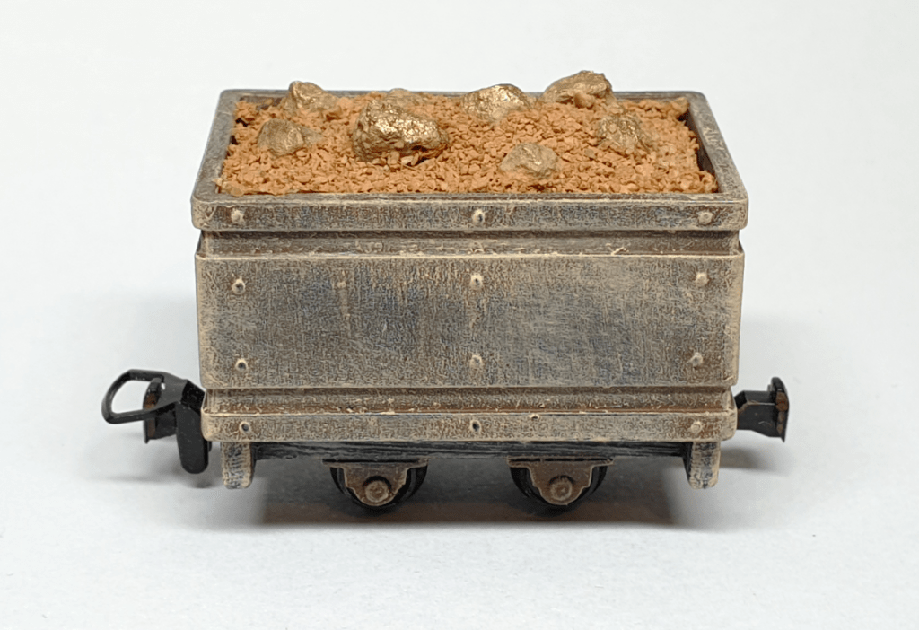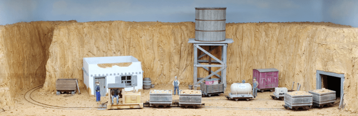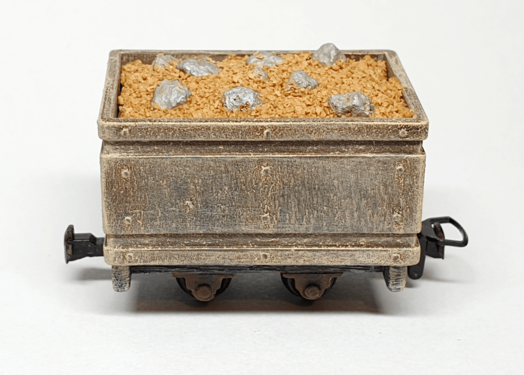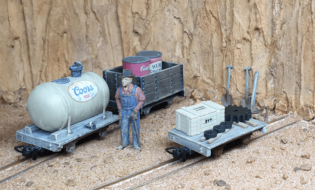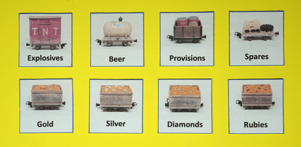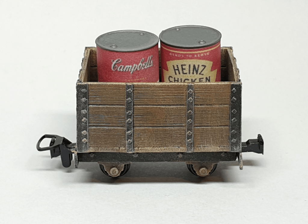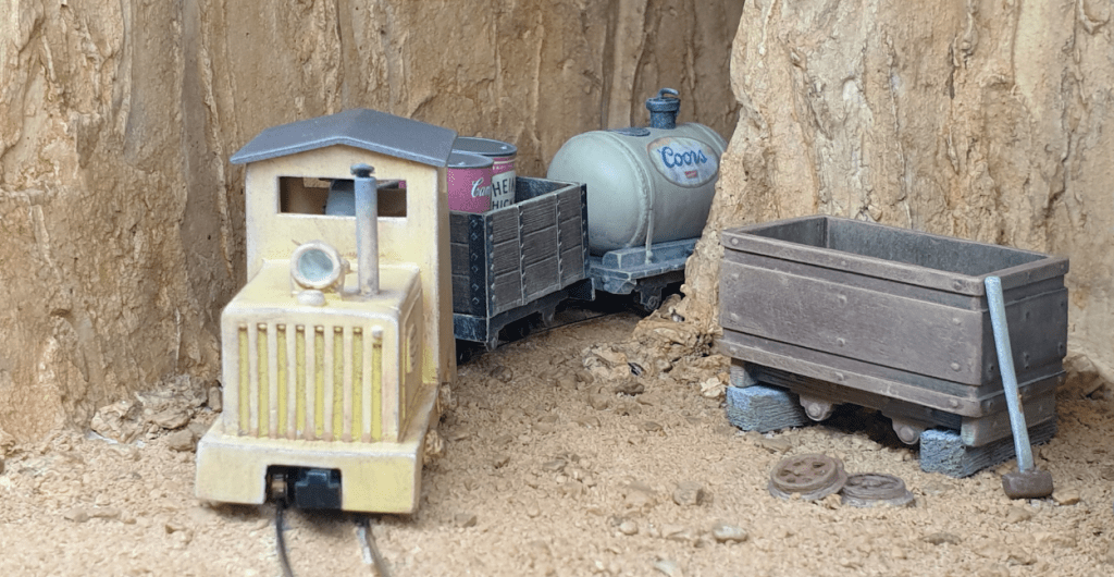 The mine tubs contain nuggets of gold or silver (cat litter granules with a dash of paint), diamonds or rubies (the ‘crystal diamante gems’ used by crafters). There’s a wagon with very large tins of soup (think Andy Warhol), a tanker of Coors beer, an explosives van and a flat wagon with some spares. Yes, I’m having a little fun here! (Click on a photo for a larger image).