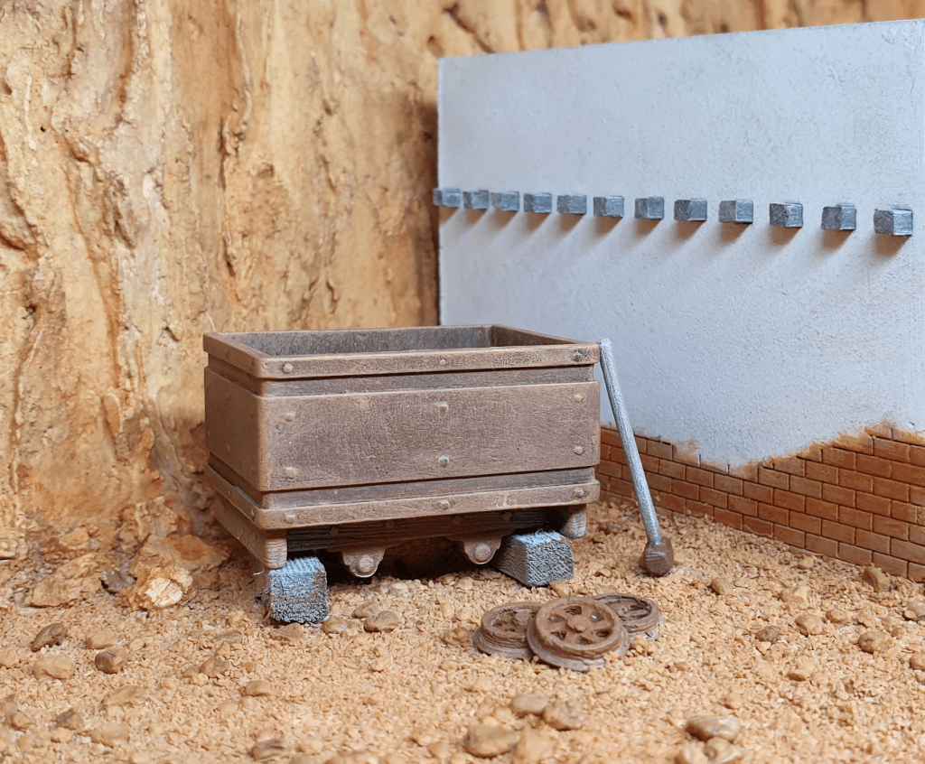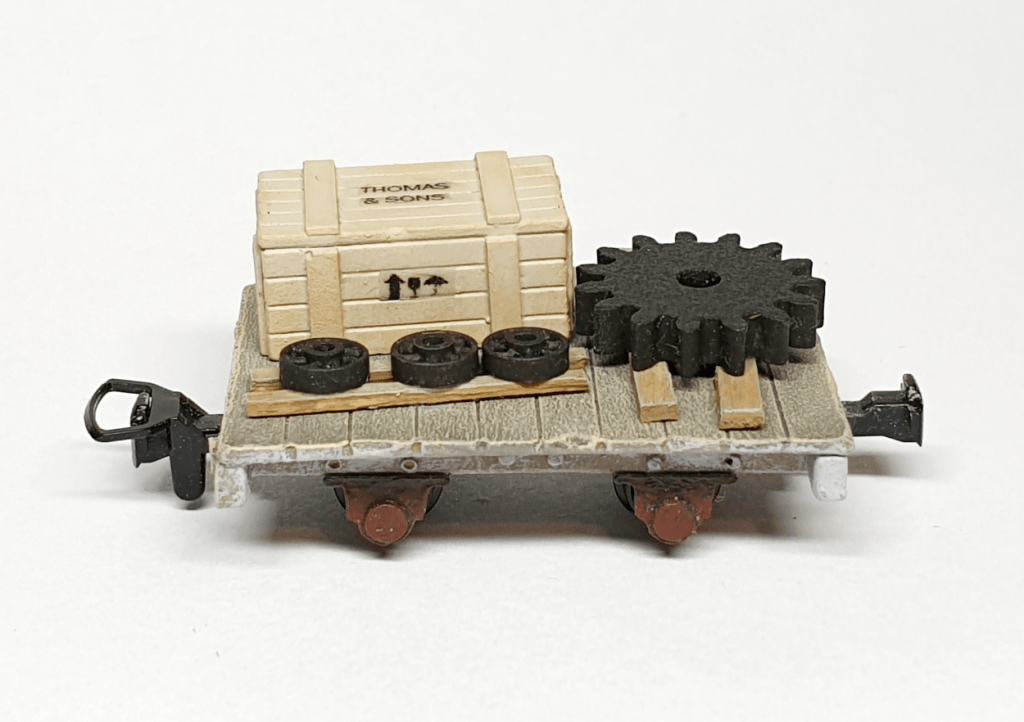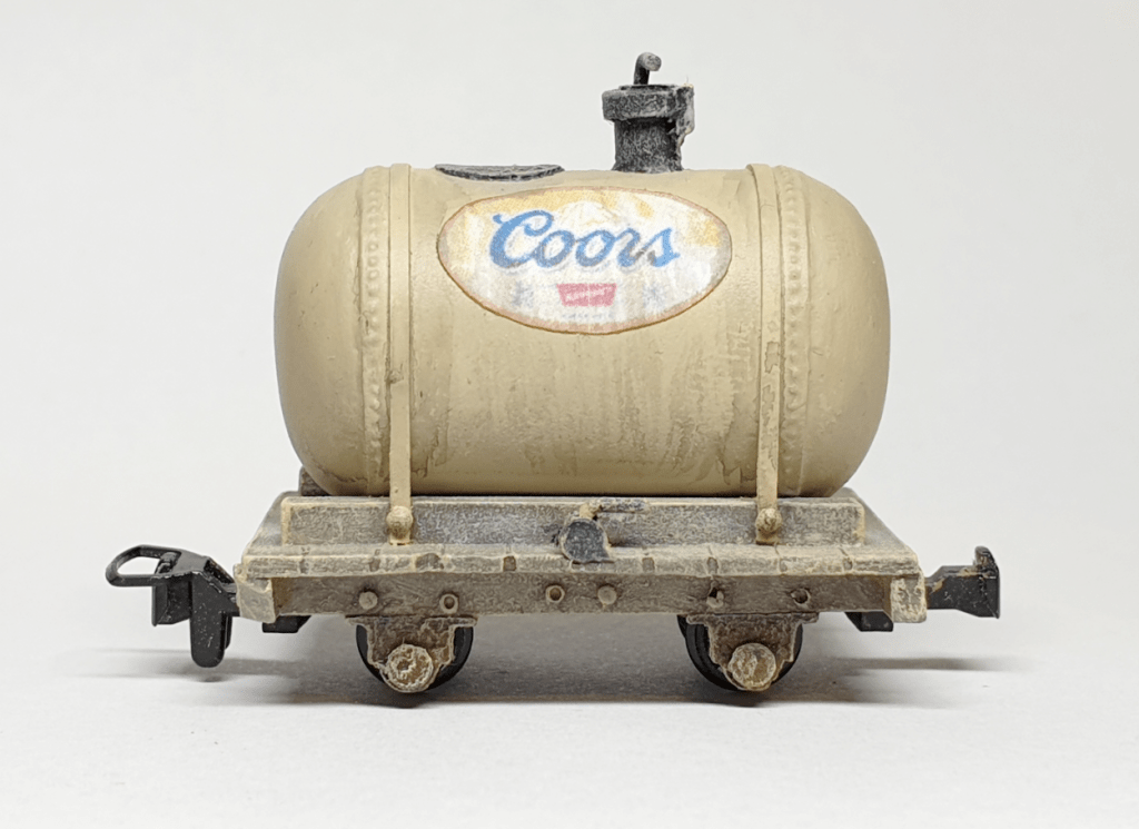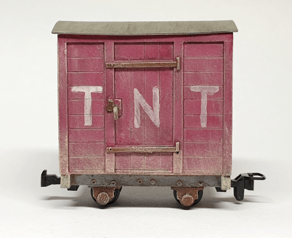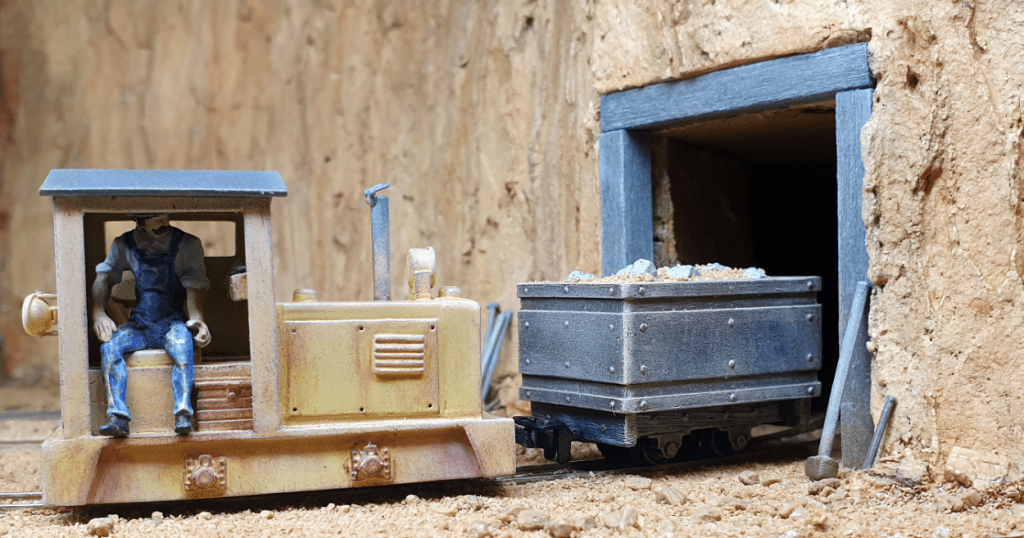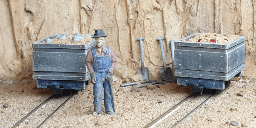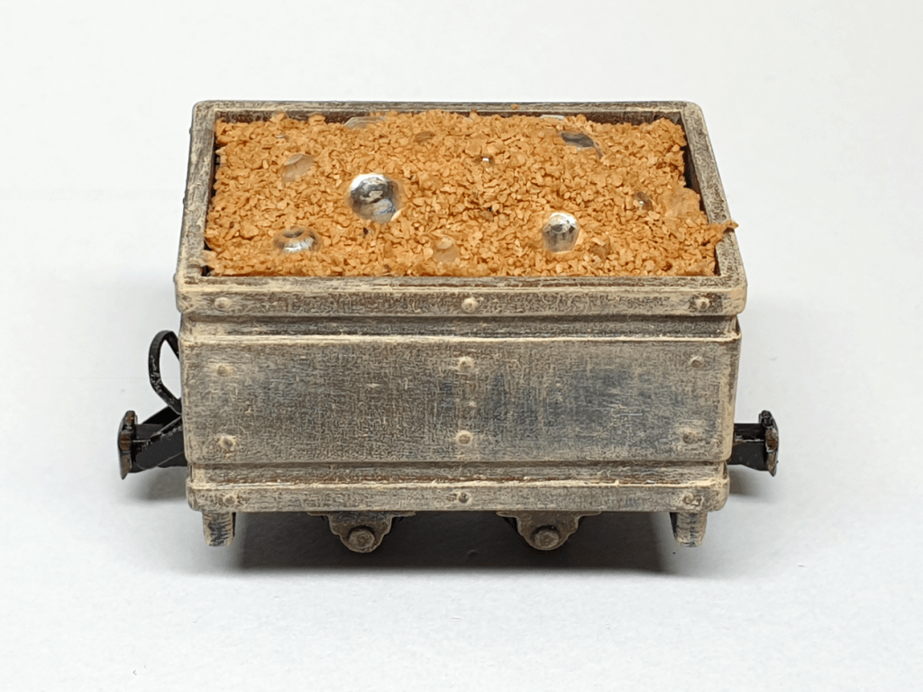 The mine tubs contain nuggets of gold or silver (cat litter granules with a dash of paint), diamonds or rubies (the ‘crystal diamante gems’ used by crafters). There’s a wagon with very large tins of soup (think Andy Warhol), a tanker of Coors beer, an explosives van and a flat wagon with some spares. Yes, I’m having a little fun here! (Click on a photo for a larger image).