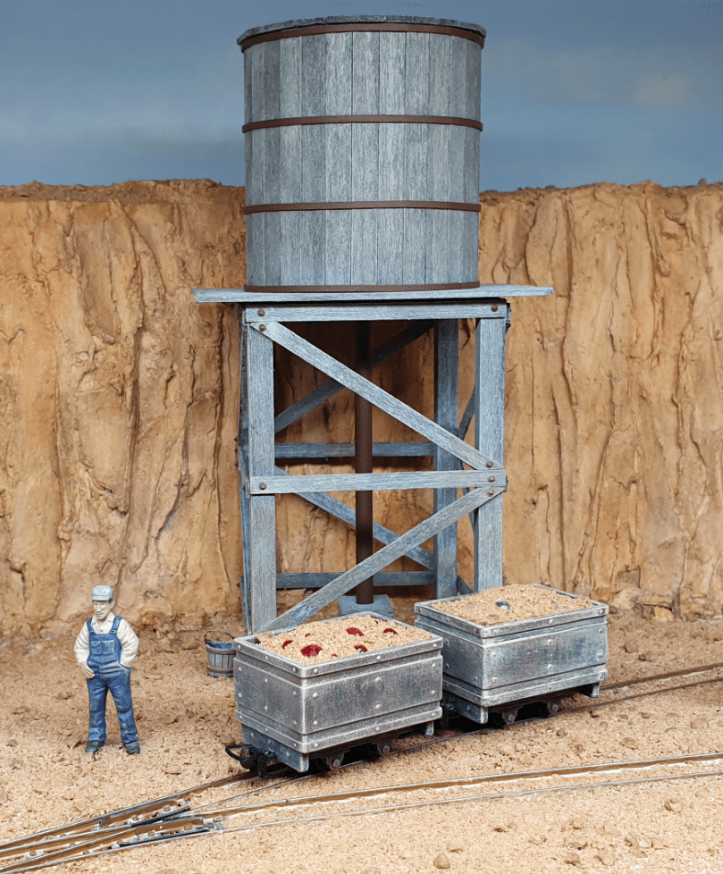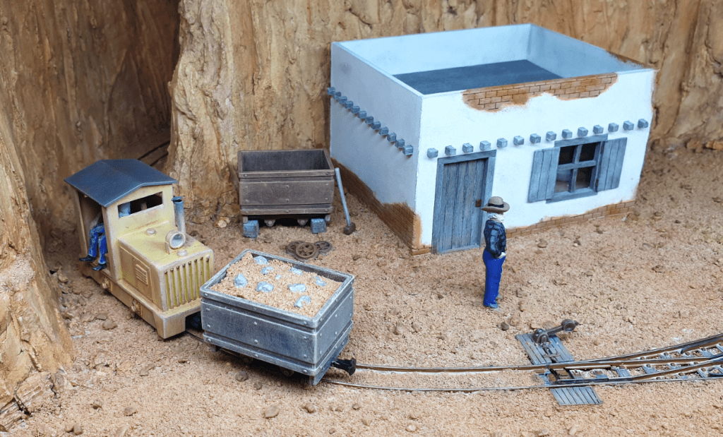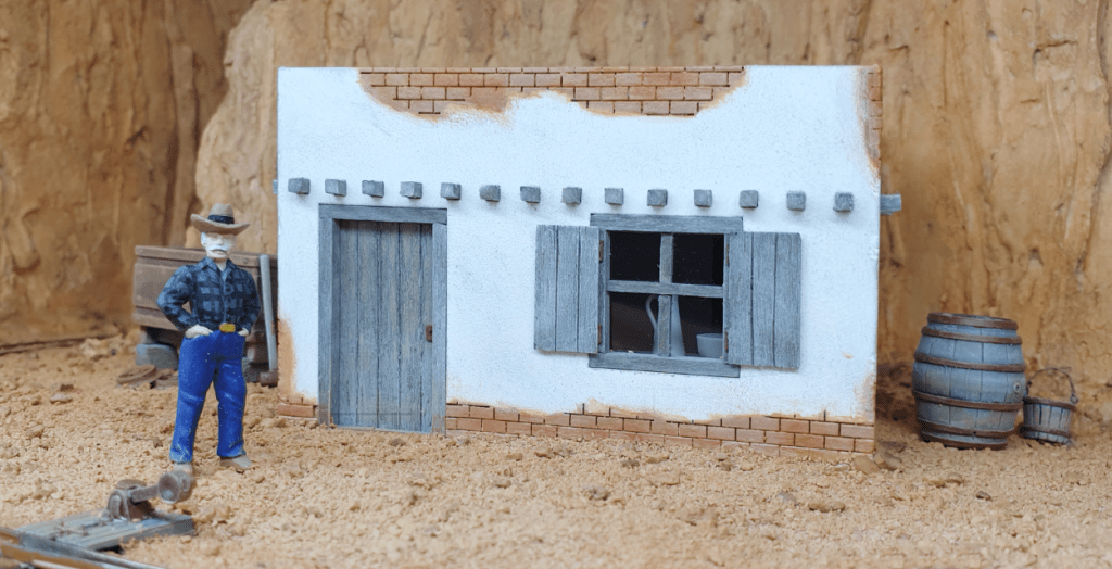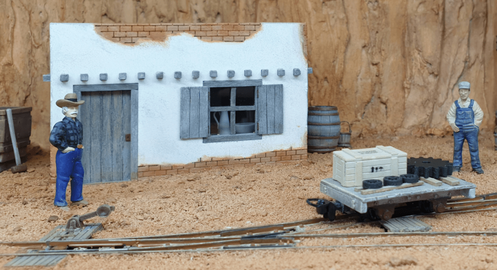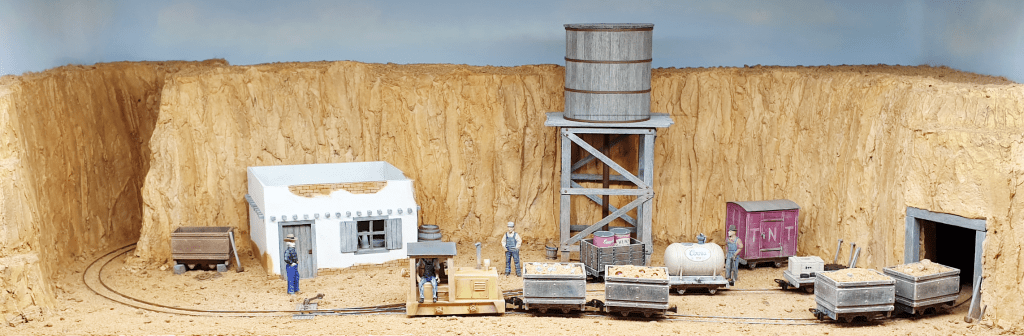 The mine is located somewhere in Arizona or New Mexico in the USA and it features some of the things I associate with those areas: an Adobe building, a wooden water tower and reddish rocks. Perhaps, it’s a stereotypical rather than a prototypical view!